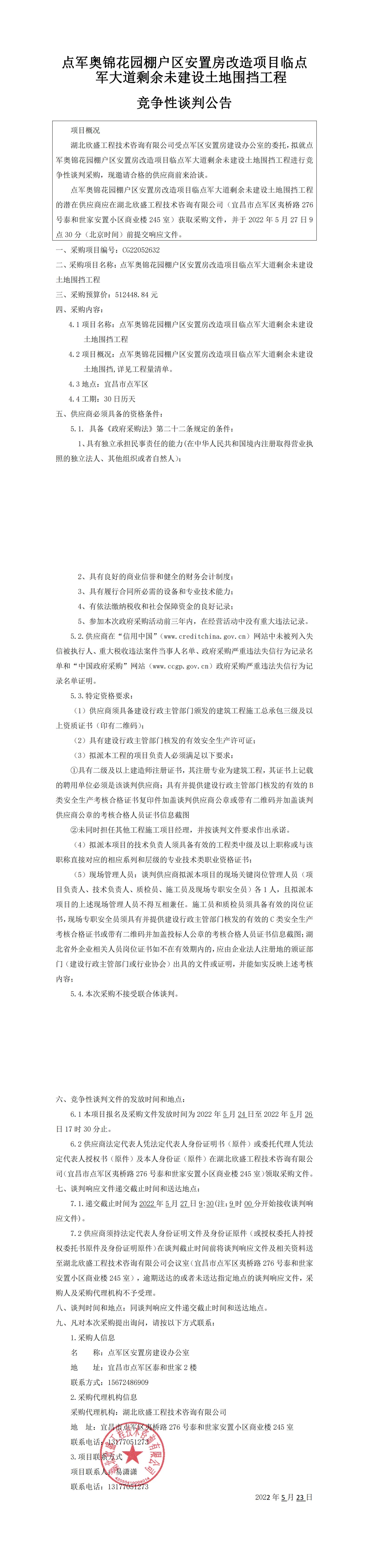 點軍奧錦花園棚戶區(qū)安置房改造項目臨點軍大道剩余未建設土地圍擋工程競爭性談判公告