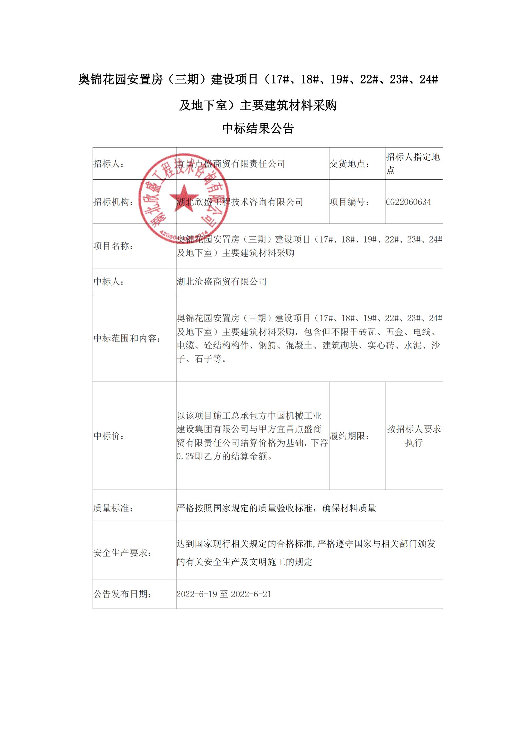 奧錦花園安置房(三期)建設(shè)項目(17#、18#、19#、22#、23#、24#及地下室)主要建筑材料采購中標(biāo)結(jié)果公告