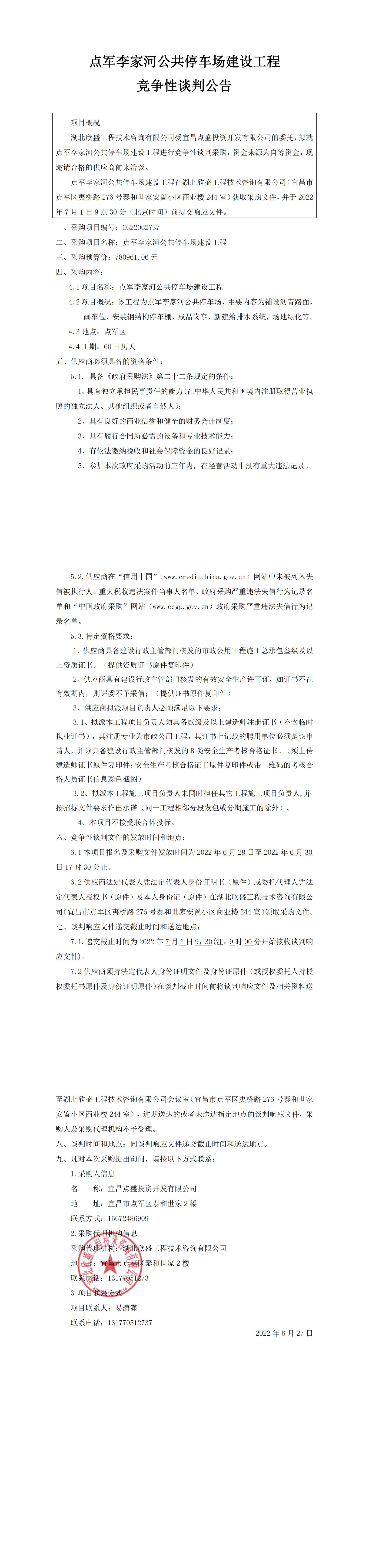 點軍李家河公共停車場建設(shè)工程競爭性談判公告