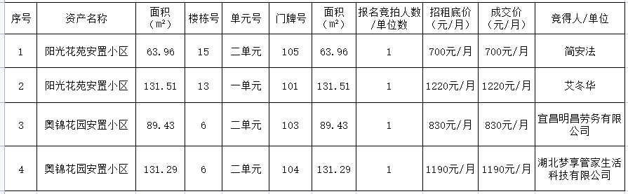 根據(jù)《點軍區(qū)出資企業(yè)資產(chǎn)租賃管理暫行辦法》及《宜昌點盛投資開發(fā)有限公司國有資產(chǎn)經(jīng)營使用實施辦法修訂版(2022.3)》,現(xiàn)對奧錦花園、陽光花苑安置小區(qū)住宅三年租賃權公開招租結(jié)果公告如下:
