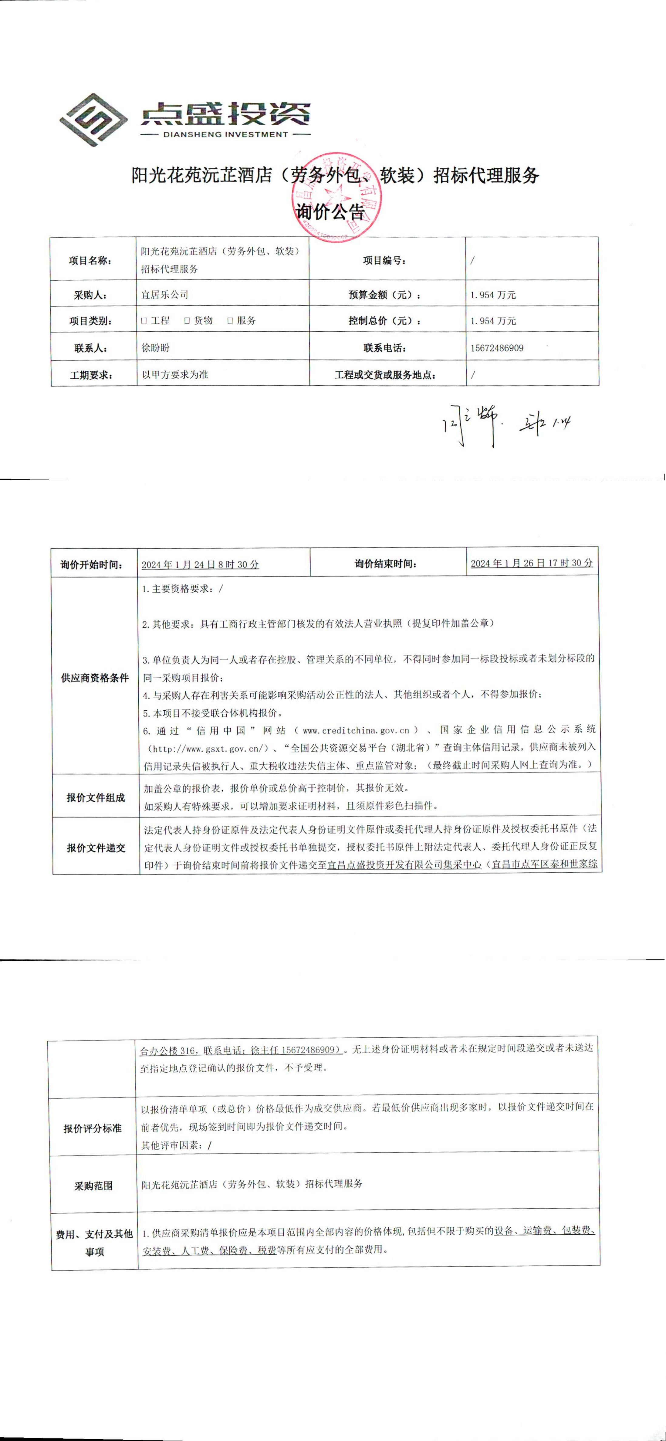 陽光花苑沅芷酒店(勞務(wù)外包、軟裝)招標代理服務(wù)?詢價公告