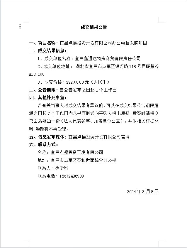 宜昌點(diǎn)盛投資開發(fā)有限公司辦公電腦采購項(xiàng)目成交公告