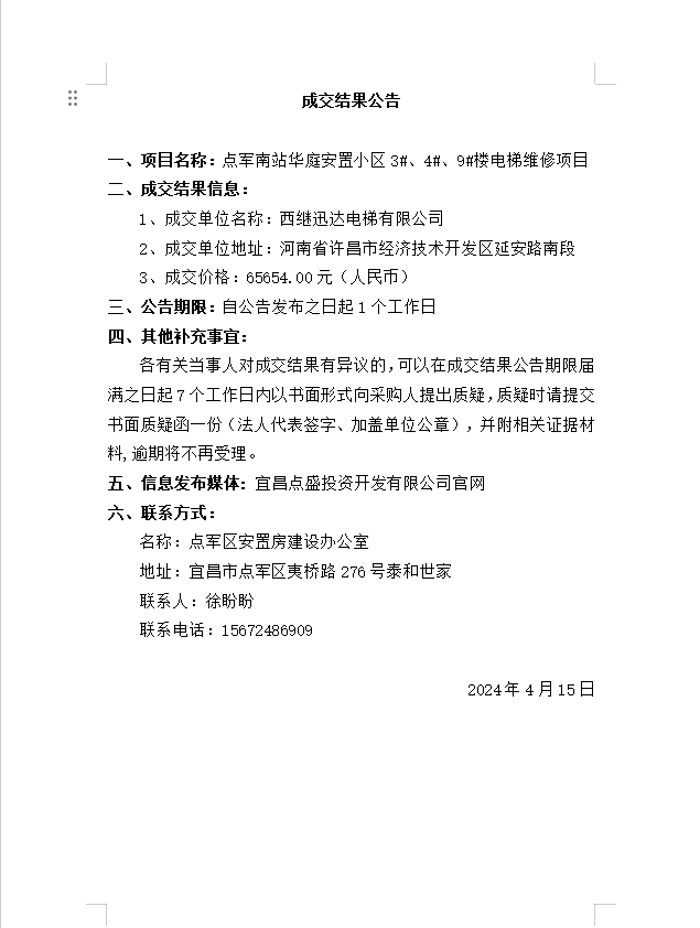 點(diǎn)軍南站華庭安置小區(qū)3#、4#、9#樓電梯維修項目成交公告