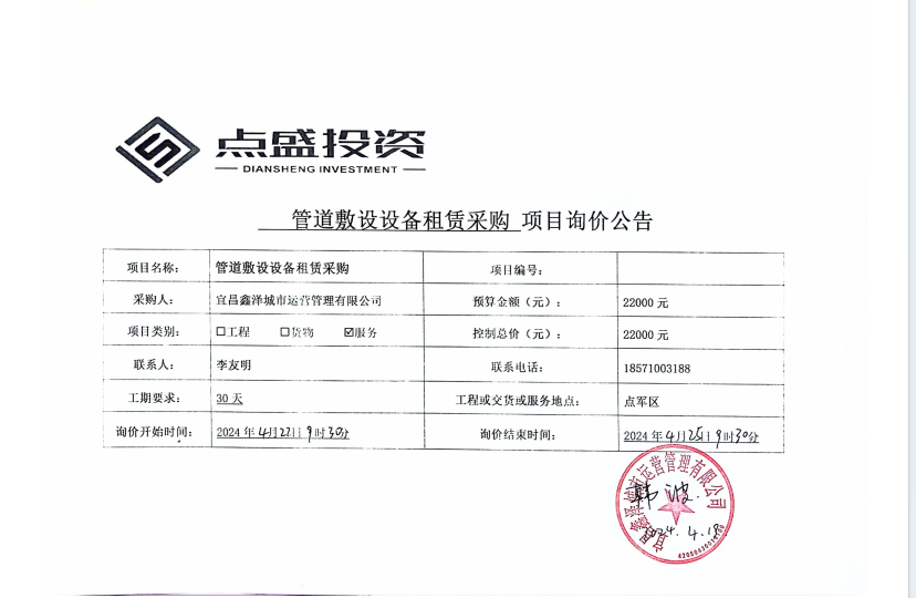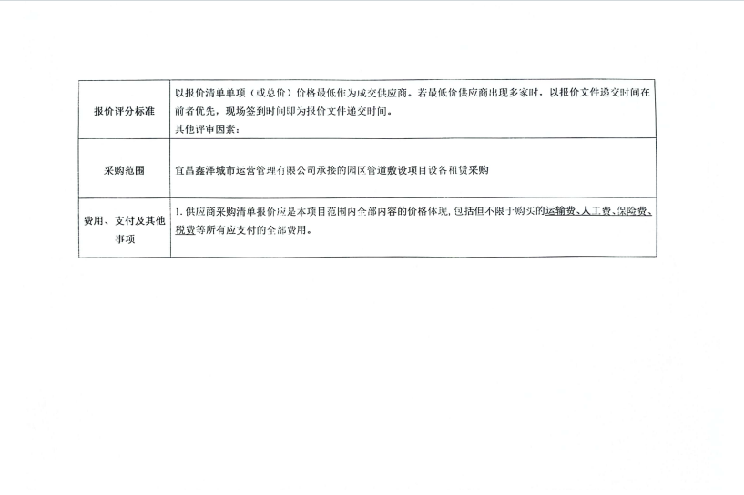 宜昌鑫澤城市運(yùn)營管理有限公司管道敷設(shè)設(shè)備租賃采購項(xiàng)目詢價(jià)公告