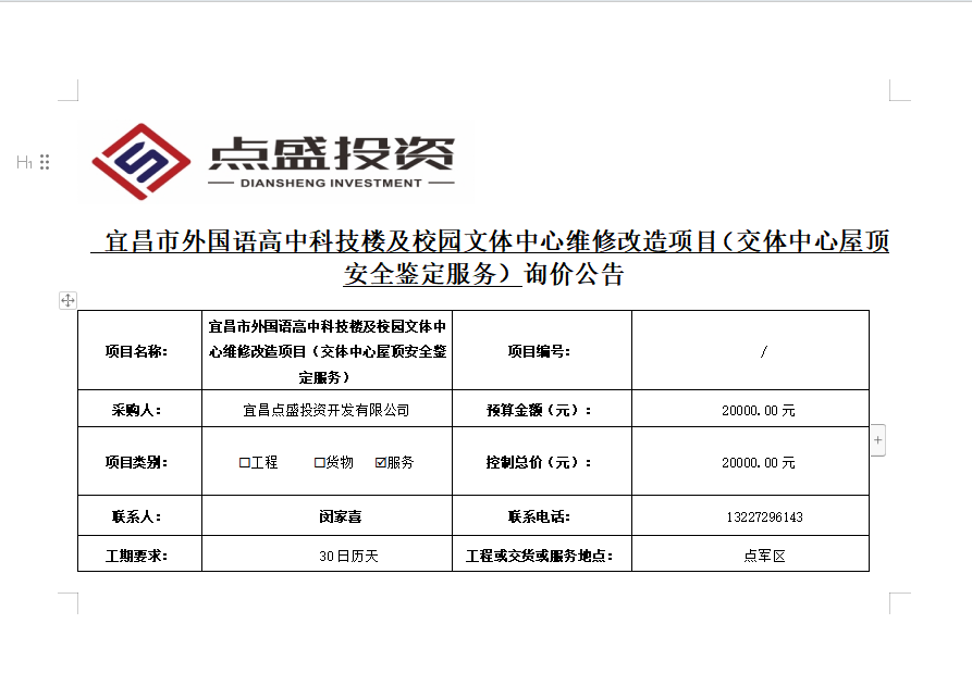 宜昌市外國語高中科技樓及校園文體中心維修改造項(xiàng)目(交體中心屋頂安全鑒定服務(wù))詢價(jià)公告