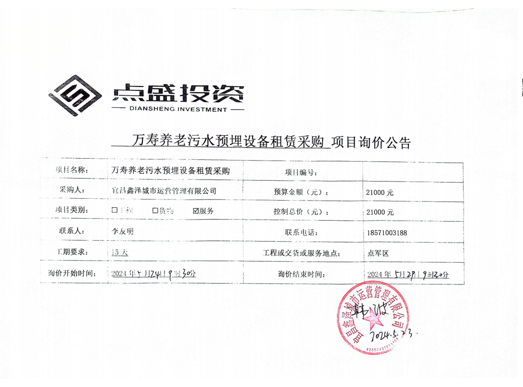 萬壽養(yǎng)老污水預埋設備租賃采購詢價公告