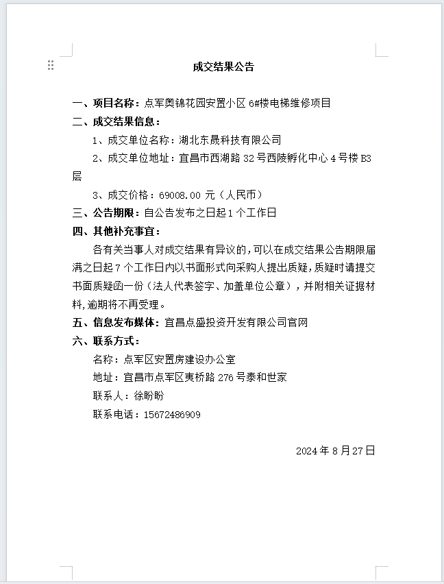 點軍奧錦花園安置小區(qū)6#樓電梯維修項目成交公告