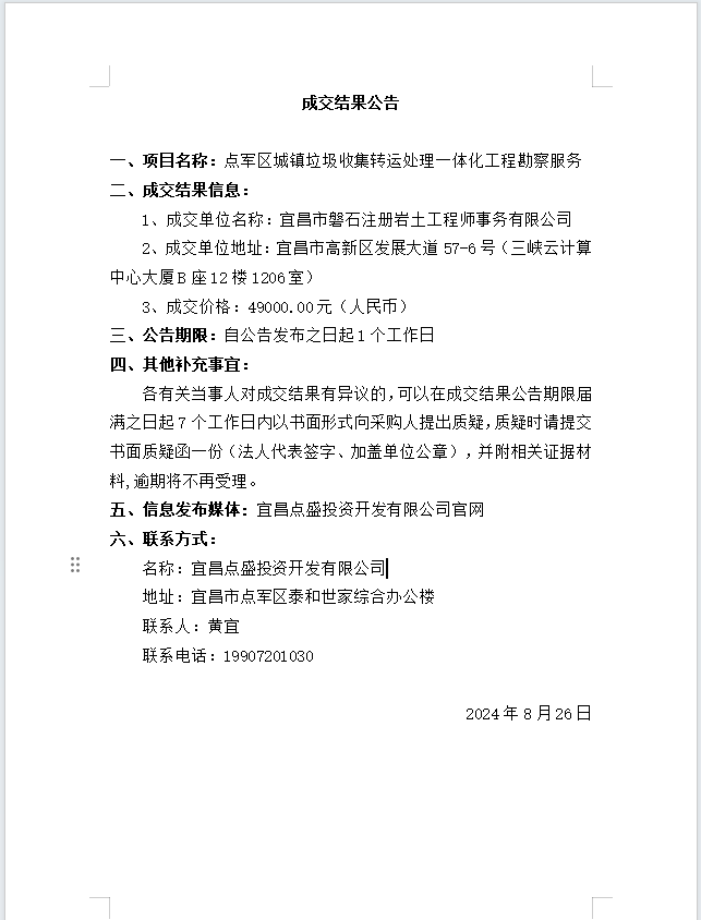 點軍區(qū)城鎮(zhèn)垃圾收集轉(zhuǎn)運處理一體化工程勘察服務(wù)成交公告