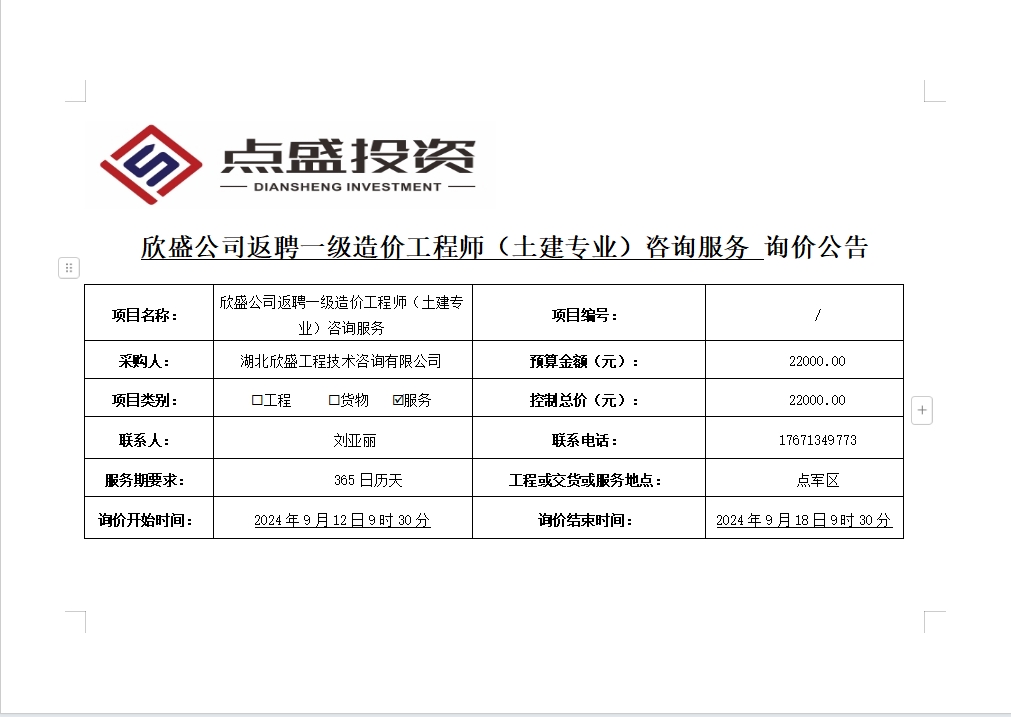 欣盛公司返聘一級造價工程師(土建專業(yè))咨詢服務(wù)詢價公告