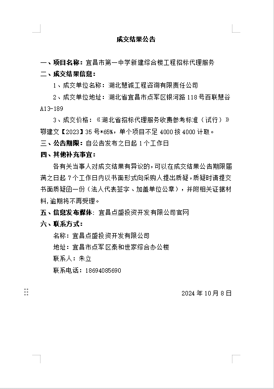 宜昌市第一中學(xué)新建綜合樓工程招標(biāo)代理服務(wù)成交公告
