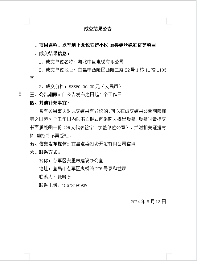 點(diǎn)軍塘上龍悅安置小區(qū)3#樓鋼絲繩維修等項目成交公告