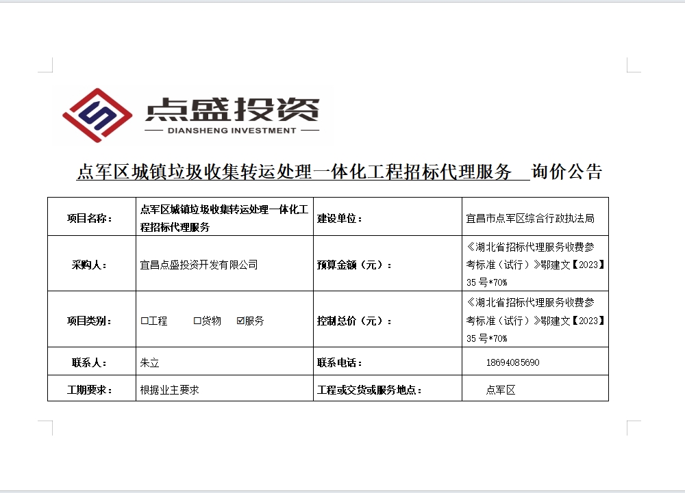 點(diǎn)軍區(qū)城鎮(zhèn)垃圾收集轉(zhuǎn)運(yùn)處理一體化工程招標(biāo)代理服務(wù)詢價(jià)公告