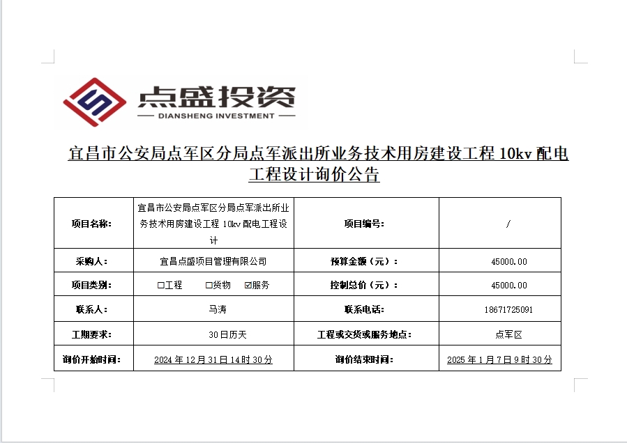 宜昌市公安局點軍區(qū)分局點軍派出所業(yè)務技術用房建設工程10kv配電工程設計詢價公告