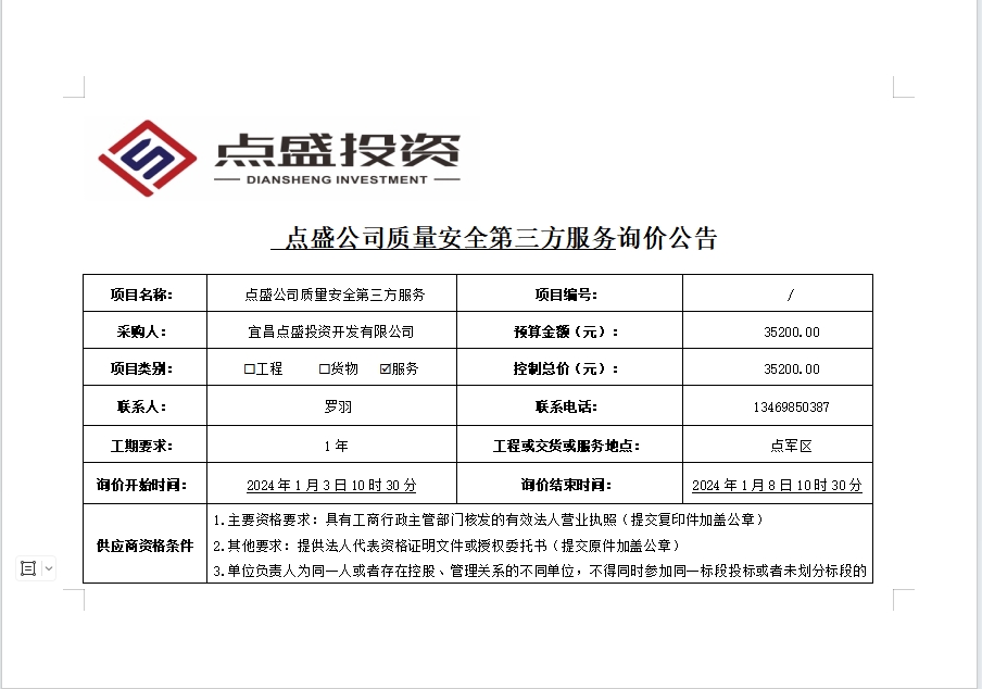 點盛公司質(zhì)量安全第三方服務(wù)詢價公告