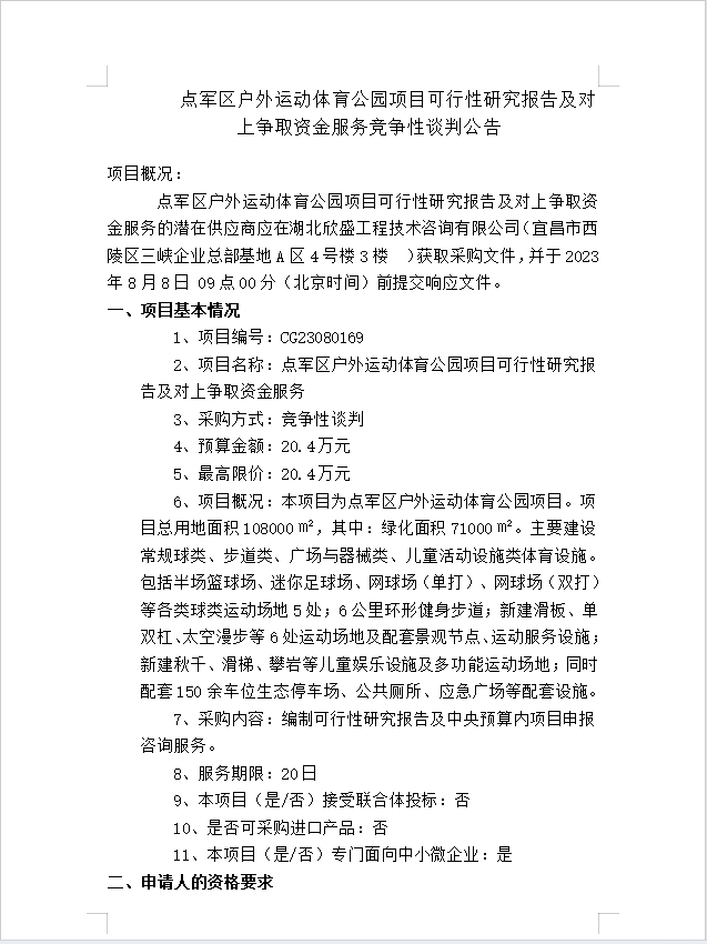 點(diǎn)軍區(qū)戶外運(yùn)動體育公園項(xiàng)目可行性研究報告及對上爭取資金服務(wù)談判公告